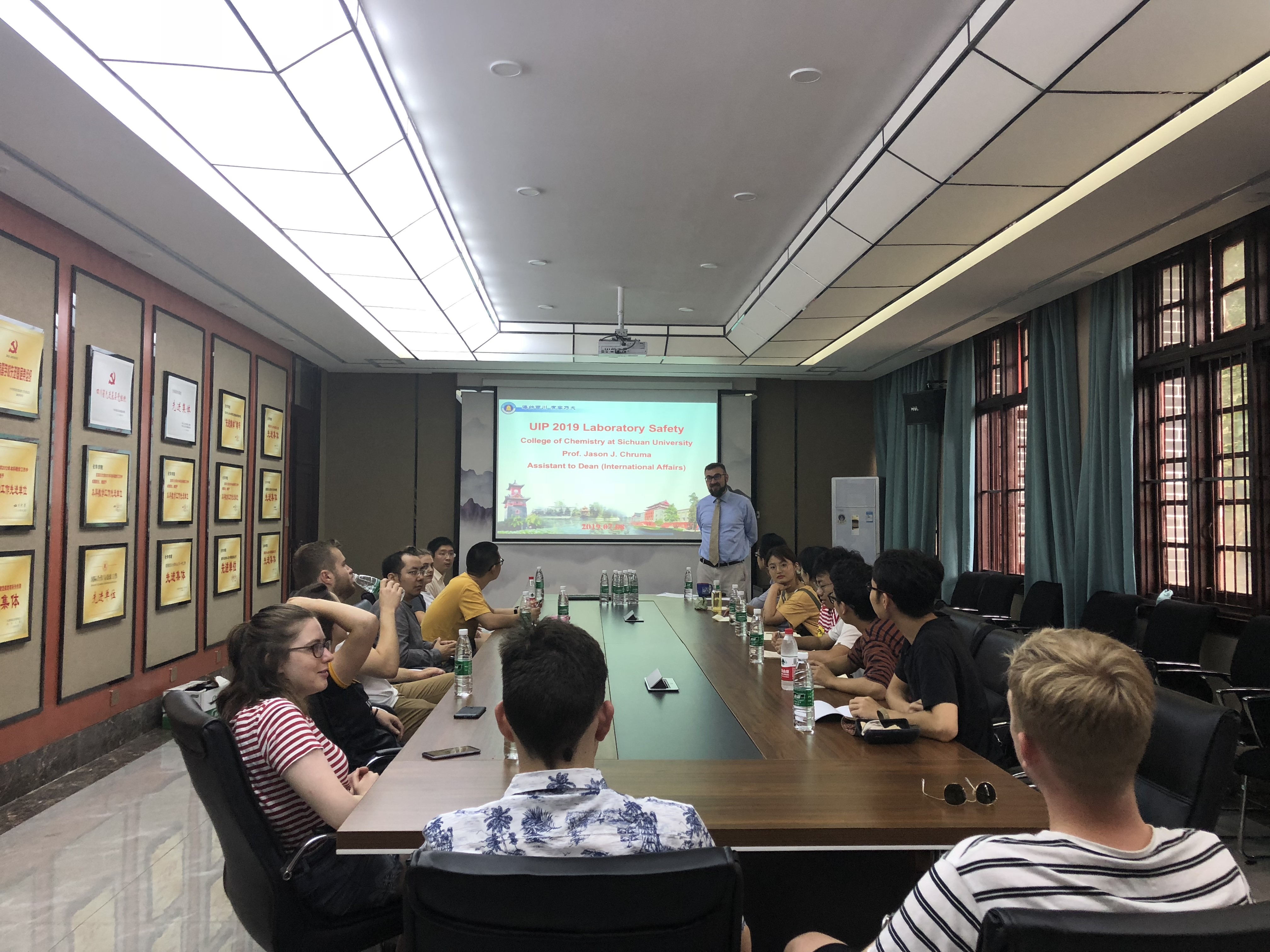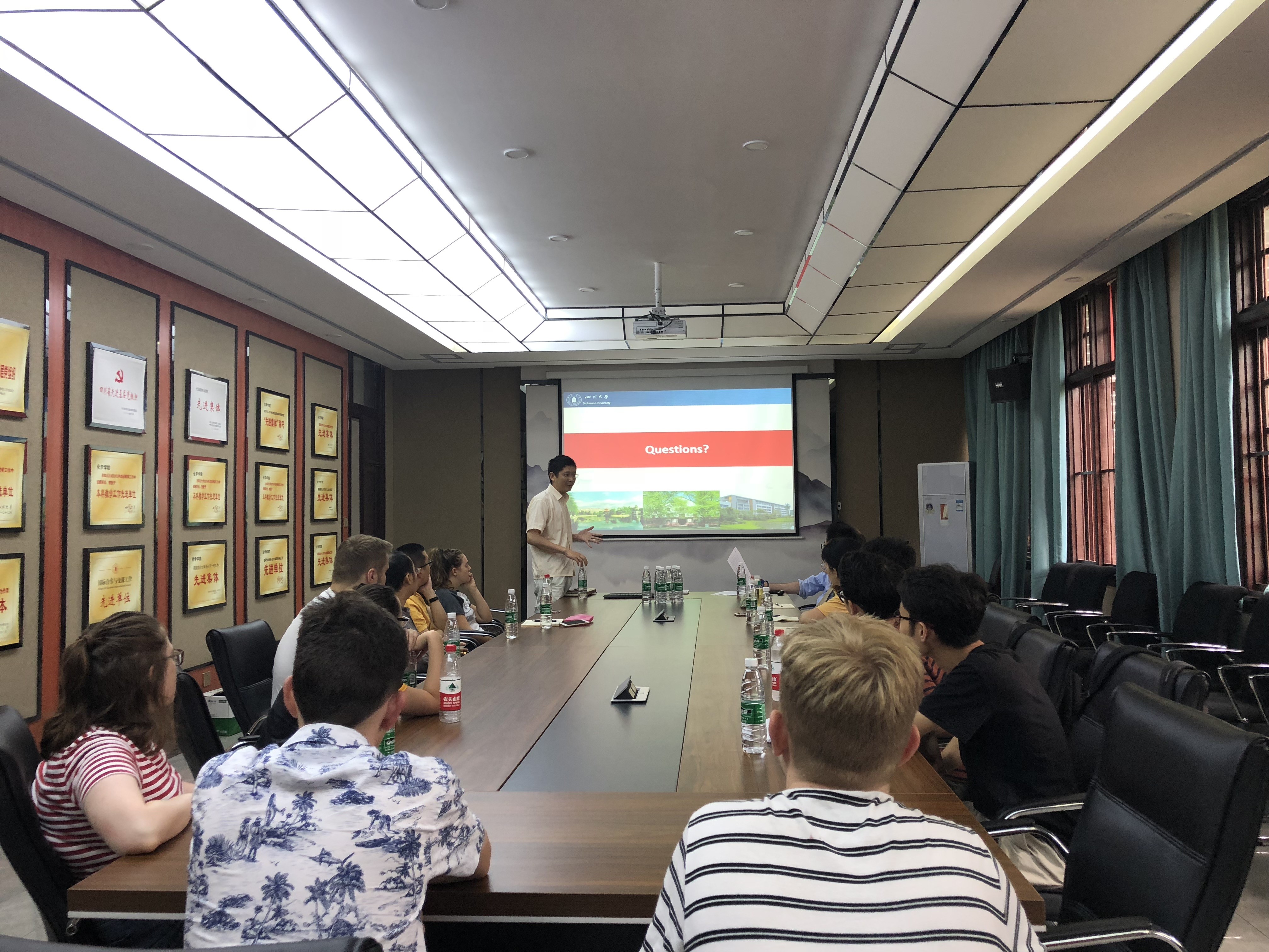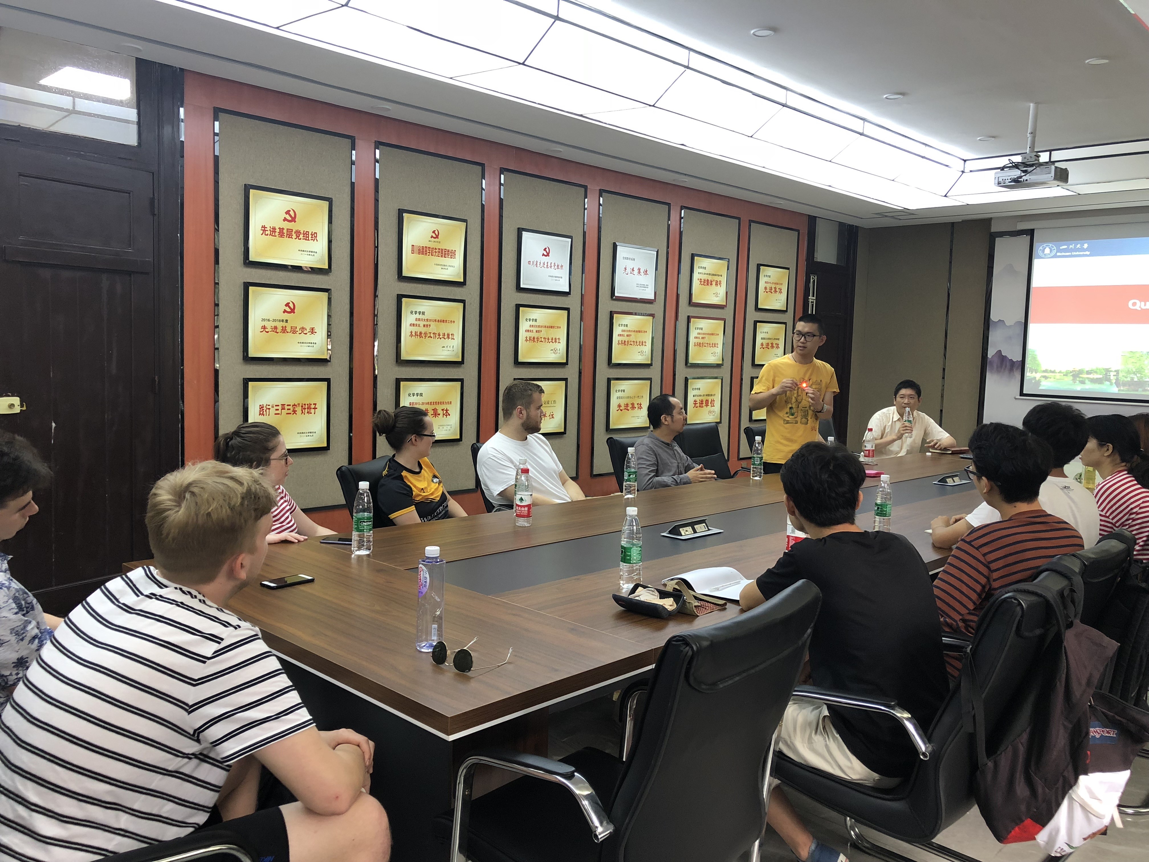 2019年7月8日早上10点,英国上市365官网2019年国际交流营活动之一——化学实验室科研周拉开帷幕。来自英国约克大学的6名留学生及英国上市365官网6名2017级本科生将分为三组进入学院化学实验室开展为期一周的科研工作,在化学馆122与科研导师余志鹏教授、杨千帆副教授、宾正杨副教授见面。英国上市365官网全职外教Jason Chruma教授、外事秘书马晓爽老师参加见面会。