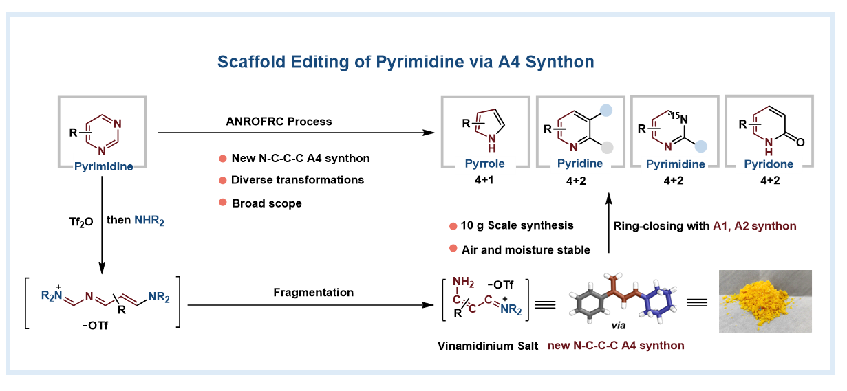 英国上市365官网付海燕/薛卫超团队开发出一种创新的嘧啶骨架编辑策略,通过亲电驱动的ANROFRC(亲核加成-开环-裂解-关环)过程,成功将4-芳基嘧啶转化为结构多样的氮杂芳烃。该策略的关键在于原位生成稳定的Vinamidinium盐中间体,其作为独特的N-C-C-C四原子合成子,可与多种A1/A2合成子发生环化反应,高效构建吡咯、吡啶及15N标记嘧啶等杂环体系。该方法底物适用性广、官能团兼容性好,实现了从单一前体到多类氮杂环的多样性编辑,为药物分子后期修饰及先导化合物优化提供了强大工具。