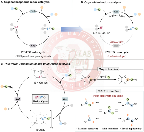 尽管均相催化领域目前仍以过渡金属配合物为主导体系,但利用廉价、环境友好的主族催化剂实现多样化的化学转化,一直是化学家们长期追求却尚未充分开拓的前沿领域。近年来,四川大学董召文课题组聚焦于具有准金属特性的低价重十四族元素试剂的精准合成与催化性能研究。围绕“低价锗、锡试剂的高效创制与功能调控”这一关键科学问题,课题组通过创新配体设计与合成策略,成功开发了多种结构新颖的低价锗、锡试剂,并率先构建了基于Ge(II)/Ge(IV)、Ge(II)/Ge(III)/Ge(IV)及Sn(II)/Sn(IV)变价循环的主族催化新体系,实现了惰性化学键的高效活化与精准转化(J. Am. Chem. Soc. 2025, doi.org/10.1021/jacs.5c12407; Nat. Commun. 2024, 15, 9849; JACS Au 2025, 5, 1289)。然而,EII/EIVO(E = Ge, Sn)催化体系的构建及其在变价催化中的应用迄今仍未实现突破,仍是该领域亟待解决的重要科学挑战。